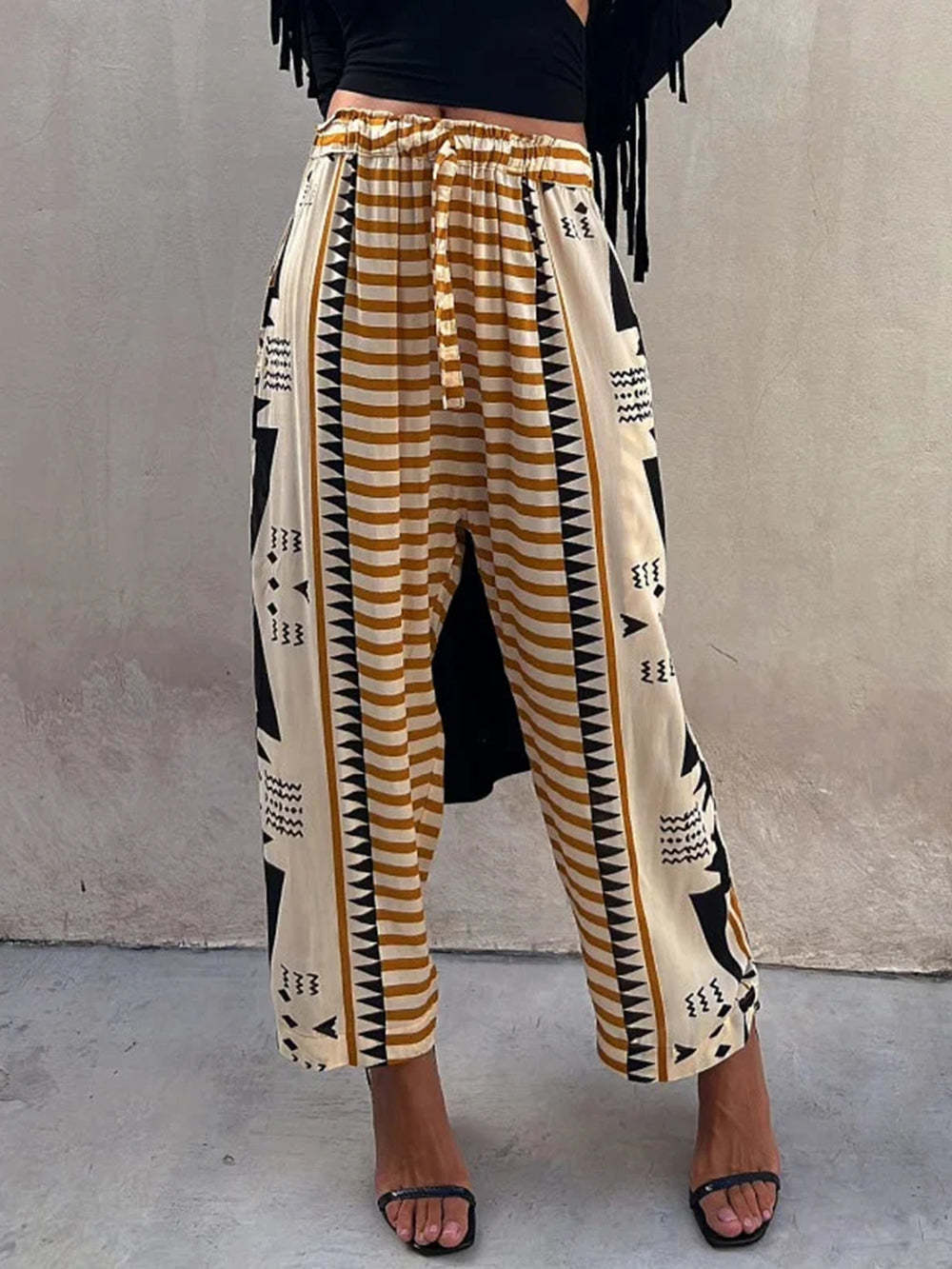These versatile pants can be styled in various ways to suit your personal style. Pair them with a simple tank top or a flowy blouse for a bohemian-inspired look. Complete the outfit with sandals, wedges, or ankle boots to create a chic and effortless ensemble.