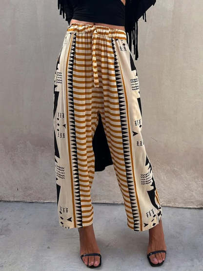 Made from high-quality materials, these pants are soft, lightweight, and breathable, making them ideal for everyday wear. The elastic waistband ensures a secure and adjustable fit, while the tapered legs add a modern touch to the bohemian aesthetic.