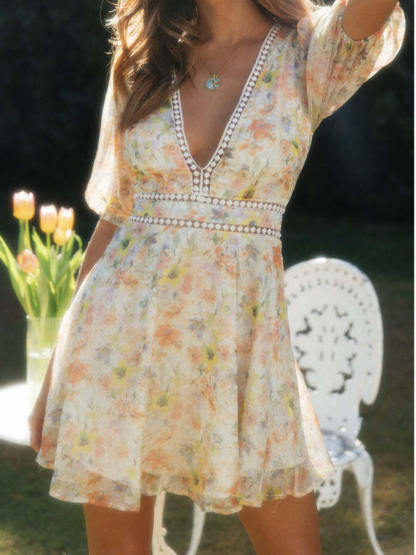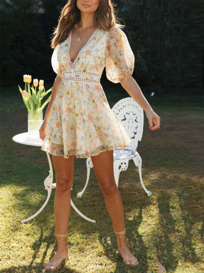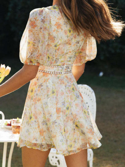 Chiffon Printed V-Neck Puff Sleeve Mini Dress
