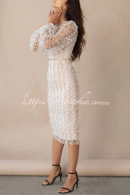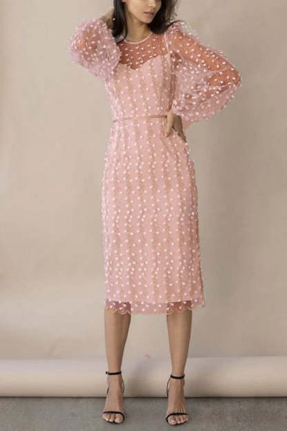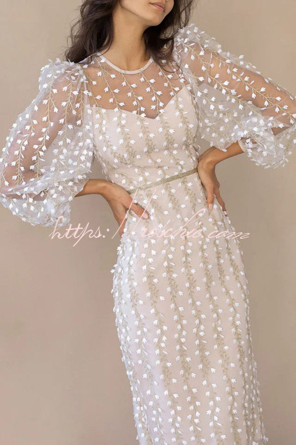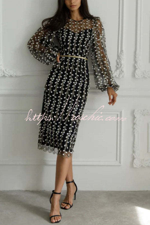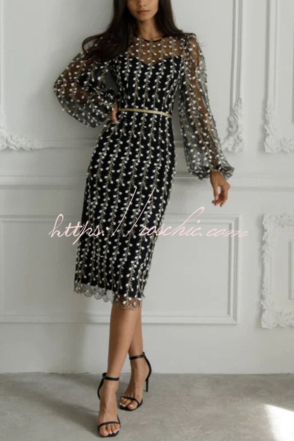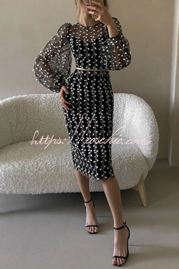 Floral Passions Embroidered Sheer balloon sleeve Fitted Midi Dress