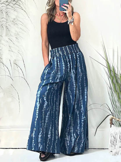 Introducing our Fun Times Printed Pocketed Smocked Wide-Leg Pants - a playful and comfortable addition to your wardrobe. Here's a description to highlight their unique features: