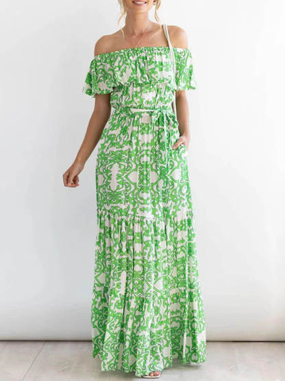 One-Shoulder Short-Sleeve Printed Ruffle Maxi Dress
