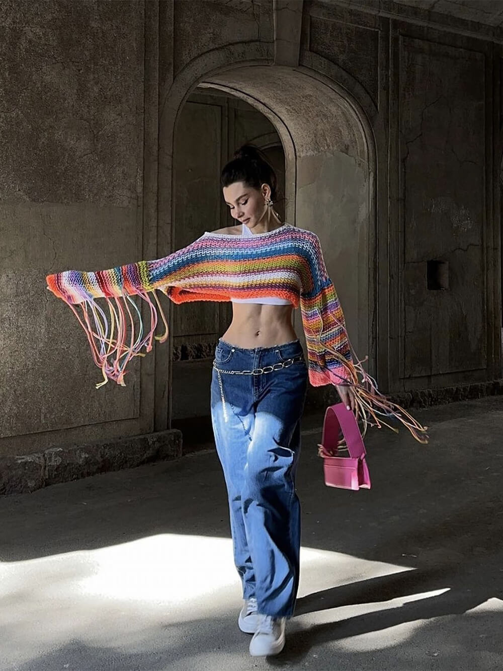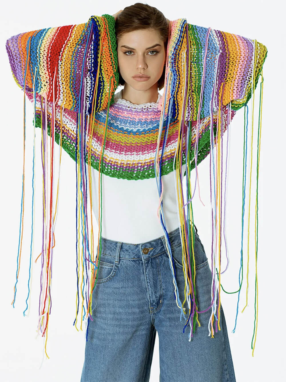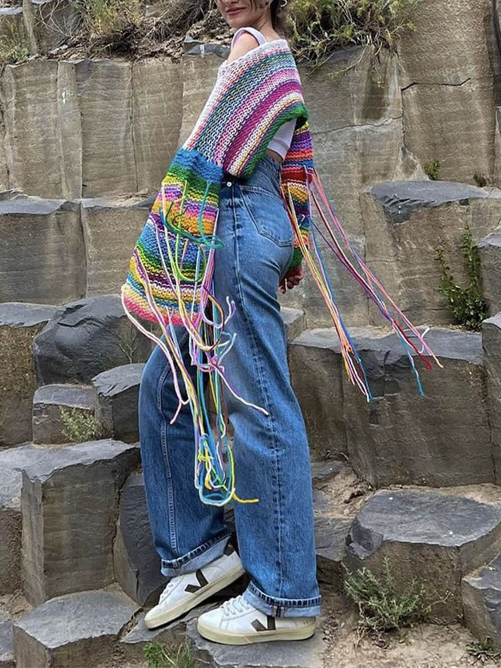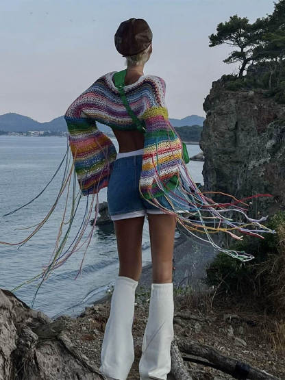Wrap yourself in a cascade of colors with this unique and eye-catching sweater. The rainbow tassels along the hem add a playful and stylish touch that's perfect for adding some personality to your outfit. Whether you're heading out for a casual gathering or just want to bring some cheer to your day, this sweater has got you covered.