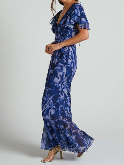 Elevate your style with this stunning maxi dress, designed to make a statement at any event. The flattering V-neckline elongates your neck, while the flutter sleeves add a touch of femininity and grace to your look.