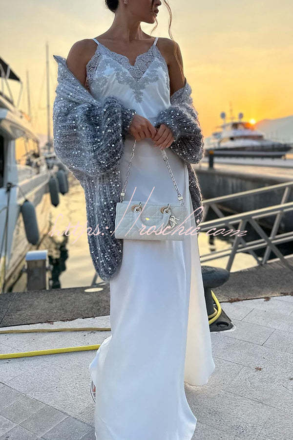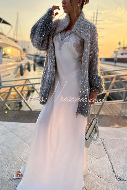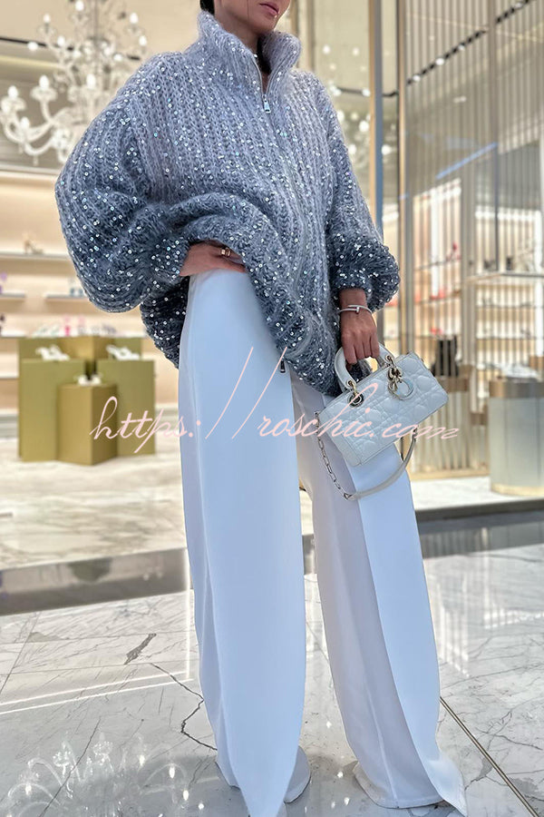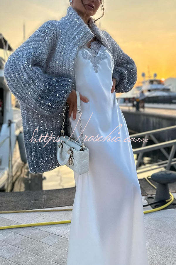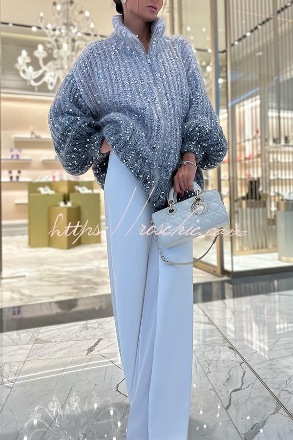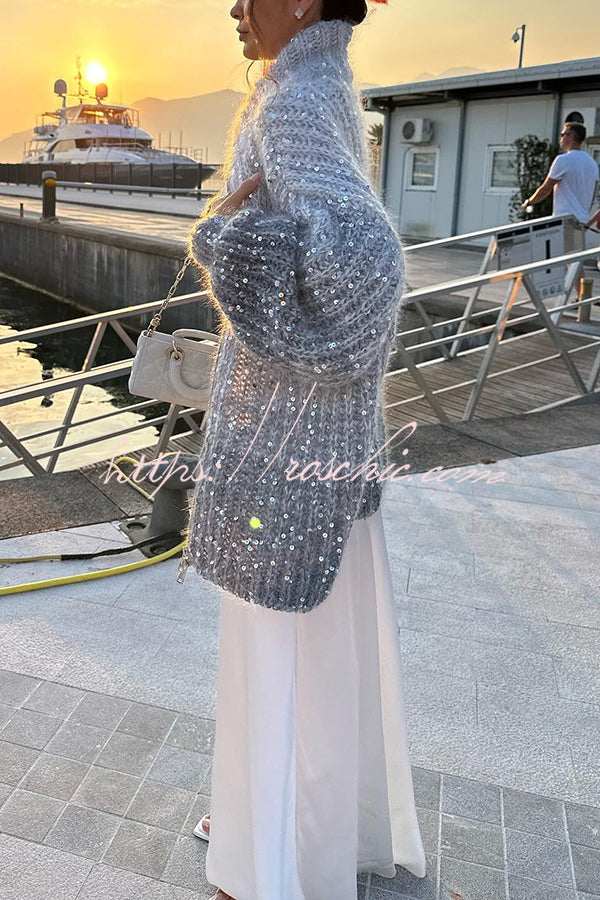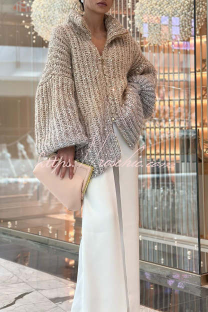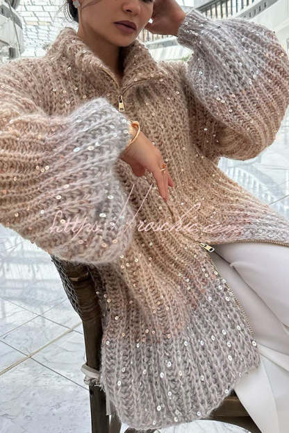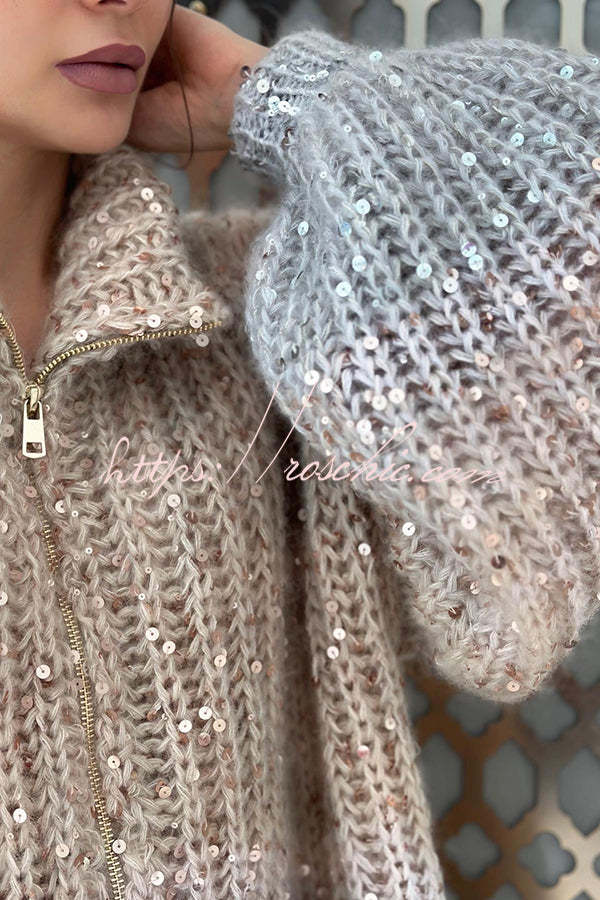 Warm Shining Heart Knit Sequin Balloon Sleeve Zipper Neck Loose Cardigan